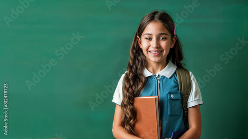 Schoolgirl with books. Young girl indoors, smiling and holding a book. She is standing in front of a green background.