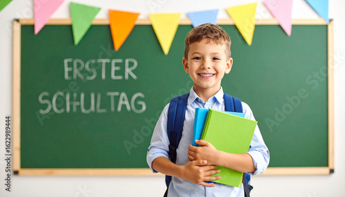 Schulkind mit Büchern vor Tafel mit „Erster Schultag“ – Junge mit Ranzen zum Schulanfang