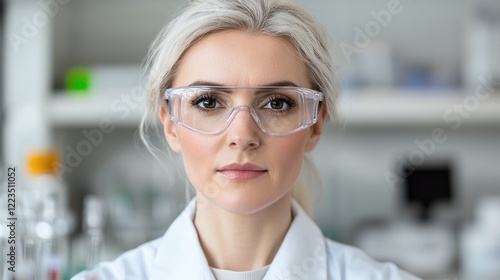 Scientist lab portrait, research focus, white coat, glassware background