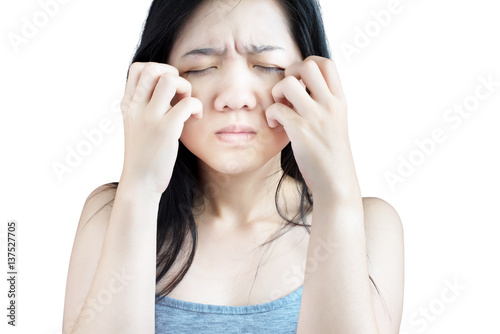 Scratching her face or cheek in a woman isolated on white background. Clipping path on white background.