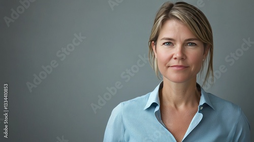Self-assured female professional in a sharp blue shirt, highlighting space to the right, with an understated gray background, polished studio feel