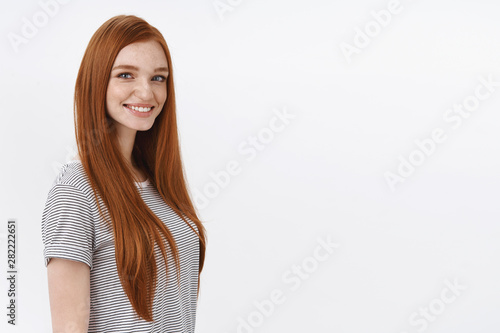 Self-assured motivated redhead talented female student blue eyes wearing striped t-shirt standing profile turning camera smiling look professional confident, white background
