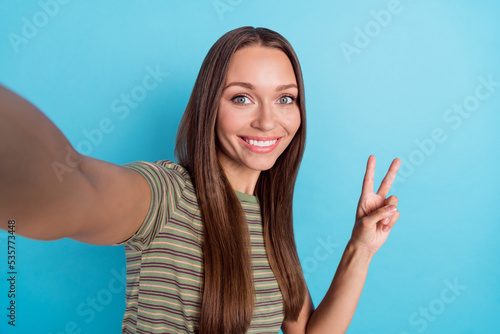 Selfie photo of young adorable pretty cute gorgeous nice lady wear t-shirt showing v-sign hello world blogger celebrity isolated on blue color background
