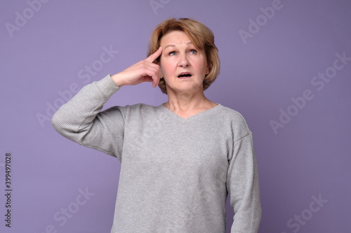 Senior caucasian woman generating idea trying to plan making right stragedy. Studio shot