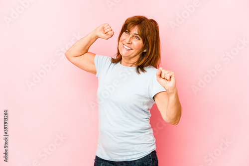 Senior caucasian woman isolated celebrating a special day, jumps and raise arms with energy.