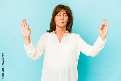 Senior caucasian woman isolated relaxes after hard working day, she is performing yoga.