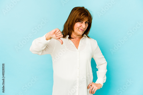 Senior caucasian woman isolated showing thumb down, disappointment concept.