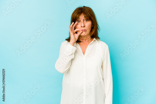 Senior caucasian woman isolated with fingers on lips keeping a secret.