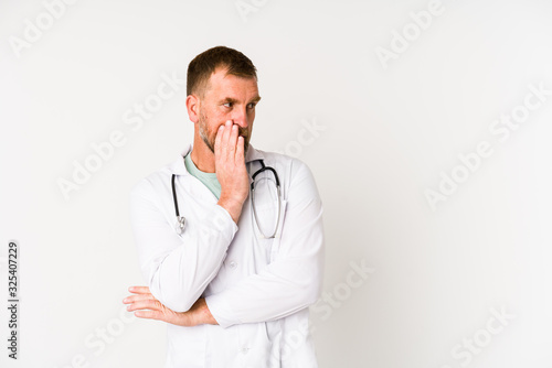 Senior doctor man isolated on white background is saying a secret hot braking news and looking aside