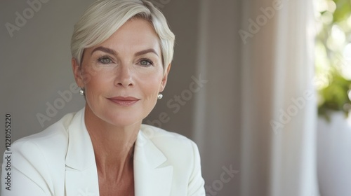 Senior executive woman with short platinum blonde hair, wearing a crisp white blazer, poised and commanding presence