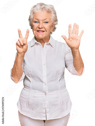Senior grey-haired woman wearing casual clothes showing and pointing up with fingers number seven while smiling confident and happy.