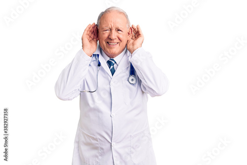 Senior handsome grey-haired man wearing doctor coat and stethoscope trying to hear both hands on ear gesture, curious for gossip. hearing problem, deaf