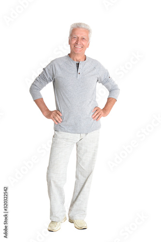 Senior man posing isolated on white background, full length