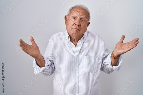 Senior man with grey hair standing over isolated background clueless and confused expression with arms and hands raised. doubt concept.