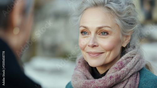 Senior woman smiling warmly, bundled in scarf, gazing softly amid urban winter streetscape