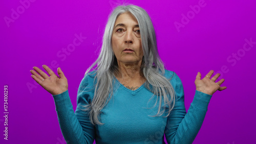 Senior woman with grey hair in a blue sweater poses against an isolated vibrant pink background, expressing with hands raised in a questioning gesture.