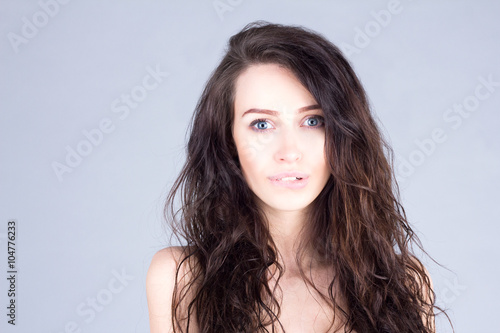 sensual woman with brown curly hair and big blue eyes biting lip. Beauty woman.