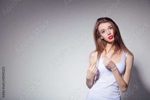 Sensual young woman with beautiful long brown hairs, posing isolated on white
