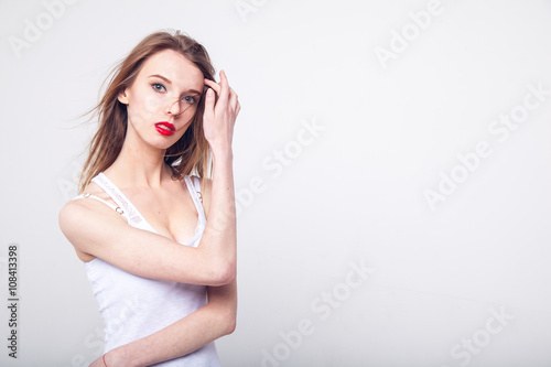 Sensual young woman with beautiful long brown hairs, posing isolated on white