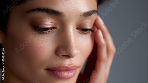 Serene Beauty: A captivating close-up portrait of a woman exudes an aura of calm serenity, her gentle touch highlighting her delicate facial features, evoking a sense of inner peace.