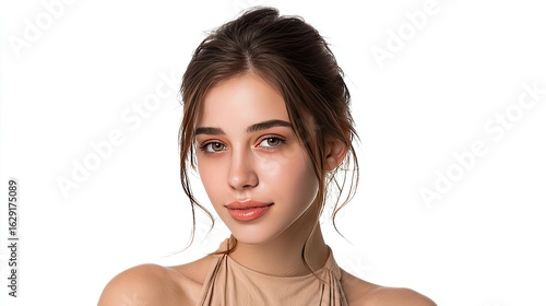 Serene Beauty: Portrait of a youthful woman with captivating eyes and natural allure, embodying calm poise.