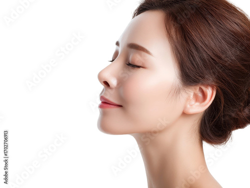 Serene Profile of a Beautiful Woman with Natural Makeup and Smooth Skin, Captivating Elegance and Graceful Beauty in Soft Lighting