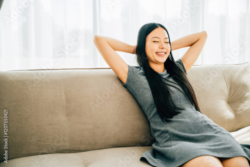 Serene woman on sofa hands behind head embraces relaxation. Dreaming and finding balance in a cozy home. Mindfulness wellbeing and comfort at its finest. Kick back and relax concept