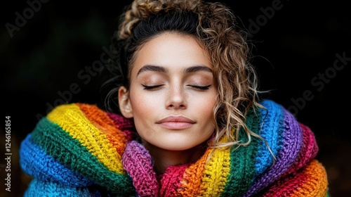Serene woman, rainbow sweater, dark background, peaceful mood, portrait
