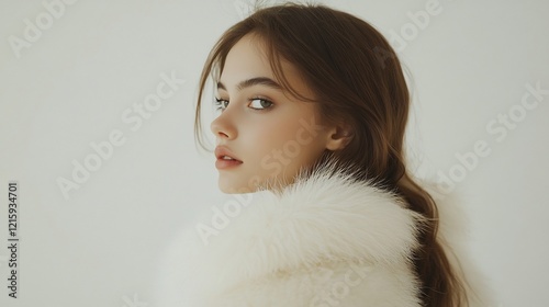 Serene woman subtly glancing back soft light illuminates her face. AI Generated