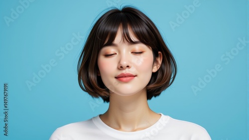 Serene Young Woman with Bob Haircut Closed Eyes Peaceful Expression Blue Background