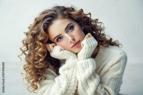 Serene Young Woman with Curly Hair in White Sweater Resting Her Face on Hands, Capturing Thoughtful Expression in Long Exposure on White Background