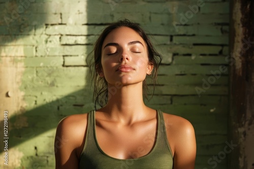 Serene young woman with eyes closed, bathed in sunlight against a rustic green brick wall.