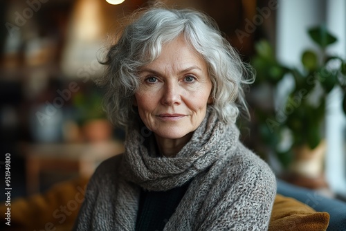 Serious and Positive Older Woman in Casual Indoor Setting Looking Directly at the Camera for a Portrait