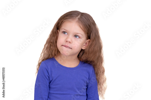 Serious and thinking child kid having a bite lower lip in planning, isolated on white background looking up waist up caucasian little girl of 5 years in blue