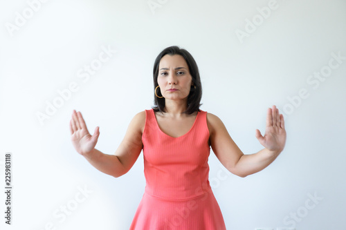 Serious attractive Caucasian woman showing retreat sign with hands and frowning. Portrait of pretty middle aged woman in pink dress withdrawing. Giving up concept.