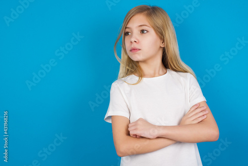 Serious beautiful Caucasian little girl wearing white T-shirt over blue background keeps hands crossed stands in thoughtful pose concentrated somewhere