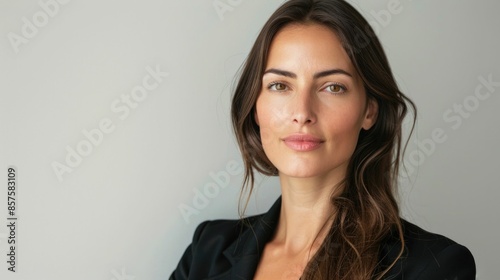 Serious businesswoman in stylish suit looking at camera with determined expression in professional setting