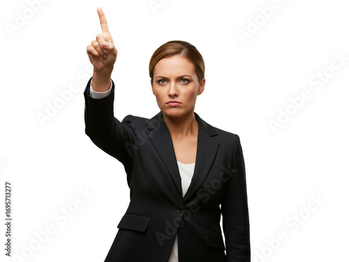 Serious businesswoman pointing upwards, indicating a virtual screen
