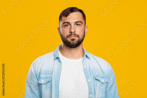 Serious calm mature european man with beard in casual look at camera, isolated on yellow background, copy space. Man ignoring someone, feeling stressed and unhappy. Facial expression and poker face