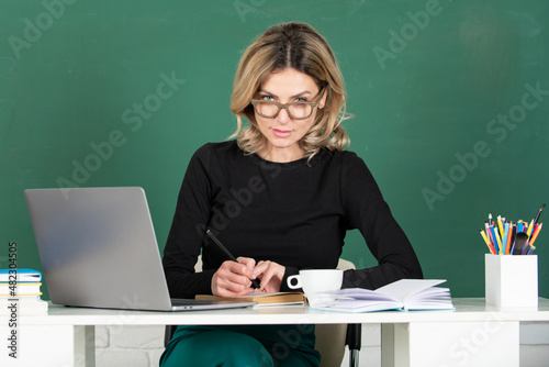 Serious concentrated teacher. Portrait of smart young woman in glasses with book on the blackboard in class at high school or collage. Female student study in university.