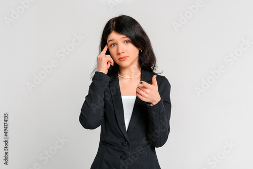 Serious dark-haired girl intensive thinking, asking to think carefully or saying: What a crazy idea. Are you an idiot. Are you kidding me