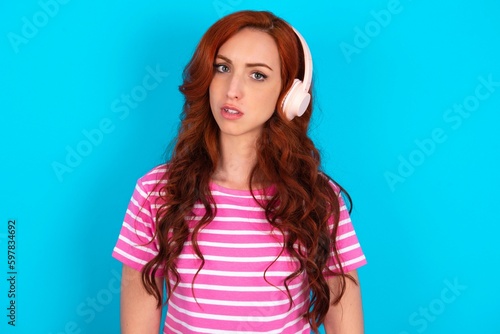 Serious displeased young redhead woman wearing striped T-shirt over blue background looks puzzled at camera being angry wears stereo headphones listens music while walking at street