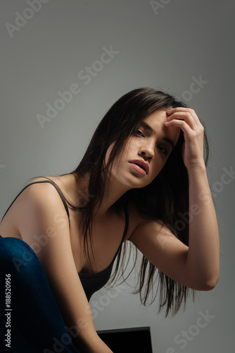 Serious lady. Beautiful unsmiling long-haired young woman sitting and staring and touching her hair