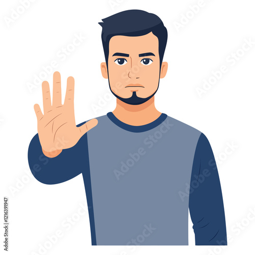 Serious Man Gesturing Stop with Raised Hand in Blue Shirt Illustration