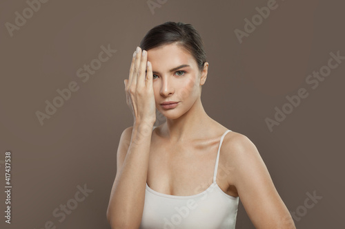 Serious woman in white t-shirt on brown background. Facial treatment, cosmetology and skin care concept