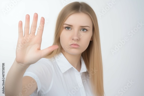 Serious woman making stop hand gesture. Lady gesturing warning reject palm symbol. Generate ai