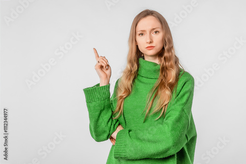 Serious woman pointing finger up. Lovely female model wears trendy knitwear green sweater standing against white studio background