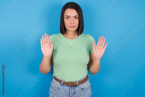 Serious young beautiful brunette girl with short hair standing against blue background pulls palms towards camera, makes stop gesture, asks to control your emotions and not be nervous