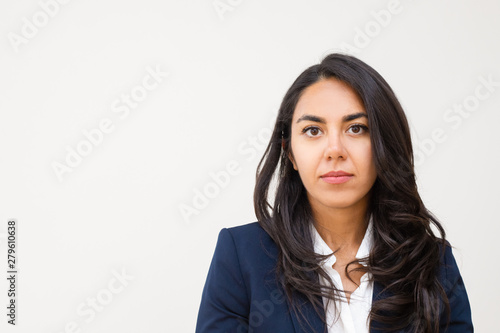 Serious young businesswoman. Portrait of beautiful young brunette businesswoman looking at camera isolated on grey background. Emotion concept