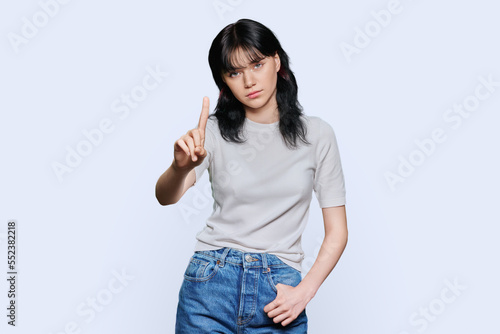 Serious young woman showing index finger up, over white studio background